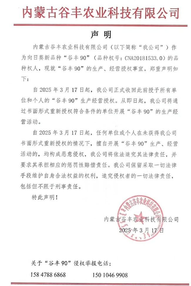 內(nèi)蒙古谷豐農(nóng)業(yè)科技有限公司(以下簡(jiǎn)稱“我公司”)作為向日葵新品種“谷豐90”(品種權(quán)號(hào):CNA20181533.0)的品種權(quán)人,現(xiàn)就“谷豐90”的生產(chǎn)、經(jīng)營授權(quán)事宜,鄭重聲明如下: