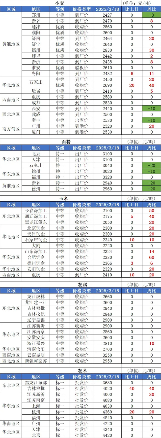 1、截至3月17日,國內(nèi)小麥市場均價為2454元/噸,環(huán)比上漲12元/噸。預(yù)計短期內(nèi)小麥價格將繼續(xù)維持區(qū)間震蕩,難以出現(xiàn)持續(xù)漲跌的情況,在政策性小麥持續(xù)輪出的壓力下,小麥價格仍有小幅回落的可能。
