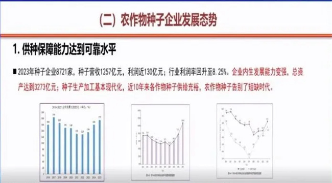 2023年,種子企業(yè)8721家,種子營收1257億元,利潤近130億元,行業(yè)利潤率回升至8.25%。企業(yè)內(nèi)生發(fā)展能力變強(qiáng),總資產(chǎn)達(dá)到3273億元,種子生產(chǎn)加工基本現(xiàn)代化。近10年來各作物種子供給充裕,農(nóng)作物種子告別短缺時(shí)代。