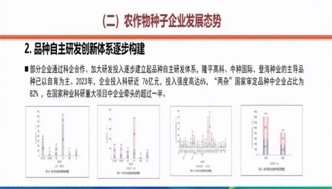 部分企業(yè)通過科企合作、加大研發(fā)投入,逐步建立品種自主研發(fā)體系。隆平高科、中種國際、登海種業(yè)的主導(dǎo)品種已以自育為主。2023年,企業(yè)投入科研近76億元,投入強(qiáng)度高達(dá)6%,“兩雜”國家審定品種中企業(yè)占比為82%,在國家種業(yè)科研重大項(xiàng)目中企業(yè)牽頭的超過一半。