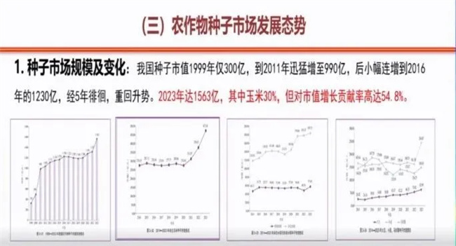 我國種子市值1999年僅300億,到2011年迅猛增至990億,后小幅連增到2016年的1230億,經(jīng)5年徘徊,重回升勢。2023年達(dá)1563億,其中玉米占30%,但對市值增長貢獻(xiàn)率高達(dá)54.8%。