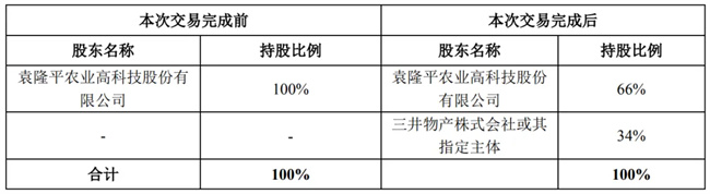 為推動(dòng)蔬菜瓜果種子業(yè)務(wù)的全面升級(jí),進(jìn)一步提升袁隆平農(nóng)業(yè)高科技股份有限公司(以下簡(jiǎn)稱“公司”)在蔬菜瓜果種子等細(xì)分領(lǐng)域的競(jìng)爭(zhēng)力和市場(chǎng)影響力,基于與Mitsui&Co.,Ltd.(三井物產(chǎn)株式會(huì)社,以下簡(jiǎn)稱“三井物產(chǎn)”)的友好合作,公司擬向三井物產(chǎn)或其指定主體出售全資子公司天津德瑞特種業(yè)有限公司(以下簡(jiǎn)稱“德瑞特”)34%股權(quán),對(duì)應(yīng)注冊(cè)資本170萬(wàn)元,轉(zhuǎn)讓價(jià)格為48,960萬(wàn)元。本次交易完成后,公司持有德瑞特66%股權(quán),本次交易不會(huì)導(dǎo)致公司合并范圍發(fā)生變化。