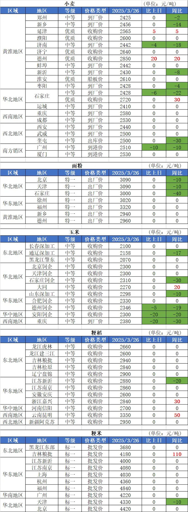 1、3月26日,國內(nèi)小麥市場平穩(wěn)偏弱運行。其中,聊城華統(tǒng)跌3厘,含票價1.209元/斤;遂平五得利跌2厘,含票價1.222元/斤;禹城五得利跌3厘,含票價1.209元/斤;商丘五得利跌3厘,含票價1.214元/斤。