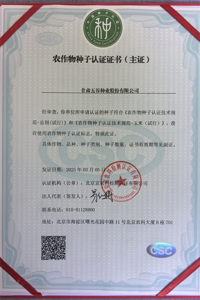 2024年,甘肅省五谷種業(yè)股份有限公司向北京京農(nóng)科檢測(cè)認(rèn)證有限公司申請(qǐng)種子認(rèn)證,面積500畝。認(rèn)證機(jī)構(gòu)根據(jù)種子認(rèn)證規(guī)則和規(guī)范的要求開(kāi)展了“四核查、兩檢驗(yàn)”工作,嚴(yán)格種子生產(chǎn)的全程質(zhì)量控制,開(kāi)展了制種親本遺傳質(zhì)量檢測(cè)、種子田核查、種子田花期田間檢驗(yàn)、種子田收獲期核查、種子批劃分核查、種子批扦樣與檢驗(yàn)等工作。