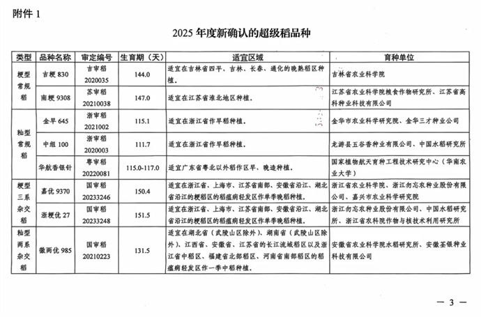 現(xiàn)確認(rèn)吉粳830、南粳9308、金早645、嘉優(yōu)9370、中組100、浙粳優(yōu) 27、徽兩優(yōu)985、春9兩優(yōu)70、臻兩優(yōu)8612、華航香銀針、荃優(yōu)607、川康優(yōu)6308、玉龍優(yōu)1611等13個(gè)品種為2025年度超級(jí)稻品種(附件1)。