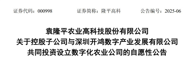 日前,袁隆平農(nóng)業(yè)高科技股份有限公司(下稱“隆平高科”)發(fā)布關(guān)于控股子公司與深圳開鴻數(shù)字產(chǎn)業(yè)發(fā)展有限公司共同投資設(shè)立數(shù)字化農(nóng)業(yè)公司的自愿性公告。
