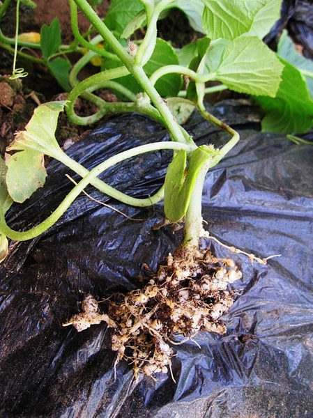 線蟲主要侵害各種蔬菜的根部,主根、側(cè)根及須根均可被侵染,形成大小和形狀不同的瘤狀根結(jié),有的呈現(xiàn)串珠狀,初為白色,后變?yōu)榈稚?,表面有龜裂?/p>