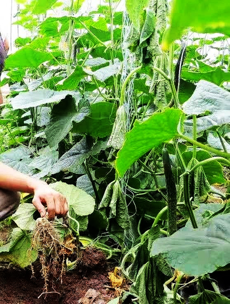 山西省太原市尹師傅租大棚種植苦瓜,由于不知道原來的棚室有根結(jié)線蟲發(fā)生,換茬時(shí)他沒有進(jìn)行悶棚處理,誰知苦瓜定植后,才結(jié)瓜1個(gè)來月,植株就因線蟲侵害,出現(xiàn)了植株弱小、萎蔫的現(xiàn)象,沒辦法只能拔園重新定植,增加了成本投入。