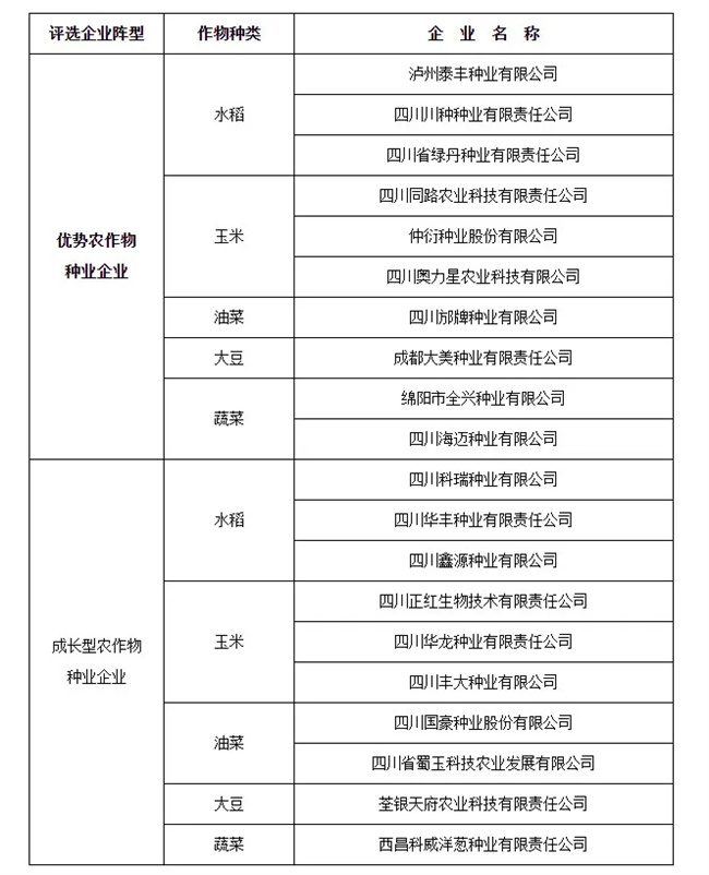 2022年,四川省農(nóng)業(yè)農(nóng)村廳發(fā)布關(guān)于四川省農(nóng)作物優(yōu)勢(shì)種業(yè)企業(yè)和成長(zhǎng)型種業(yè)企業(yè)評(píng)審結(jié)果的公示,認(rèn)定瀘州泰豐種業(yè)有限公司等10家企業(yè)為四川省優(yōu)勢(shì)農(nóng)作物種業(yè)企業(yè),四川科瑞種業(yè)有限公司等10家企業(yè)為四川省成長(zhǎng)型農(nóng)作物種業(yè)企業(yè)。