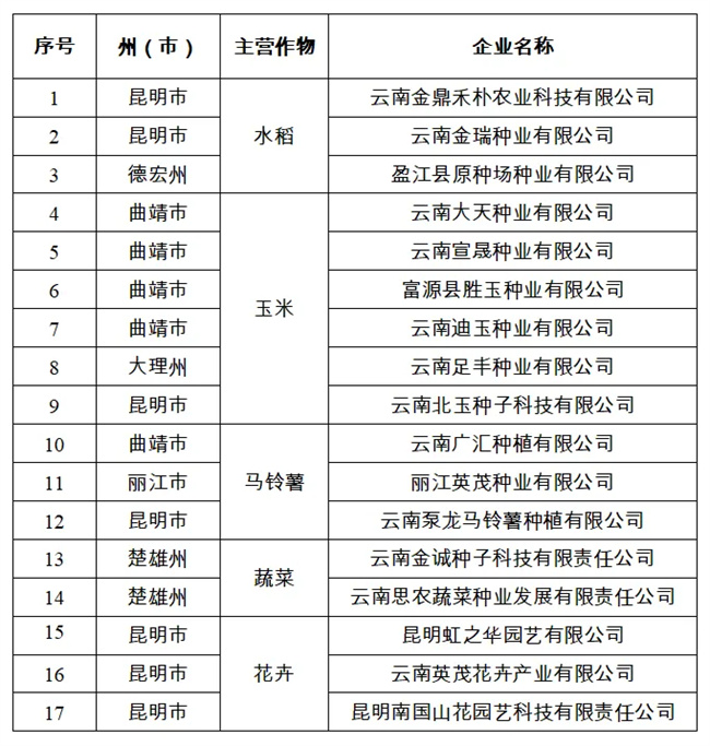 云南省級(jí)種業(yè)陣型企業(yè)名單公布