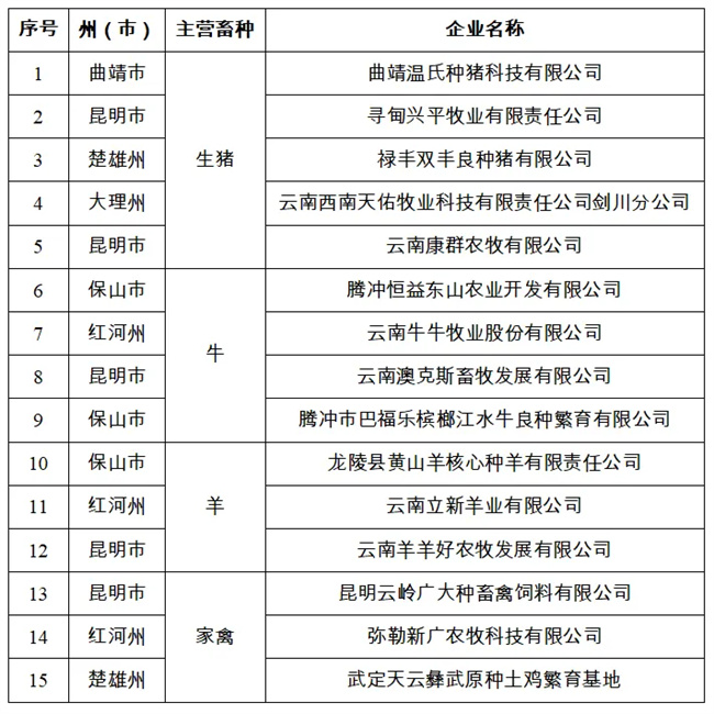 2024年5月,云南省農(nóng)業(yè)農(nóng)村廳根據(jù)企業(yè)資產(chǎn)實(shí)力、育種研發(fā)、創(chuàng)新成果、市場(chǎng)規(guī)模等情況,決定遴選云南金鼎禾樸農(nóng)業(yè)科技有限公司等17家企業(yè)為省級(jí)農(nóng)作物種業(yè)陣型企業(yè);曲靖溫氏種豬科技有限公司等15家企業(yè)為省級(jí)畜禽種業(yè)陣型企業(yè);西雙版納云博水產(chǎn)養(yǎng)殖開(kāi)發(fā)有限公司等10家企業(yè)為省級(jí)水產(chǎn)種業(yè)陣型企業(yè)。