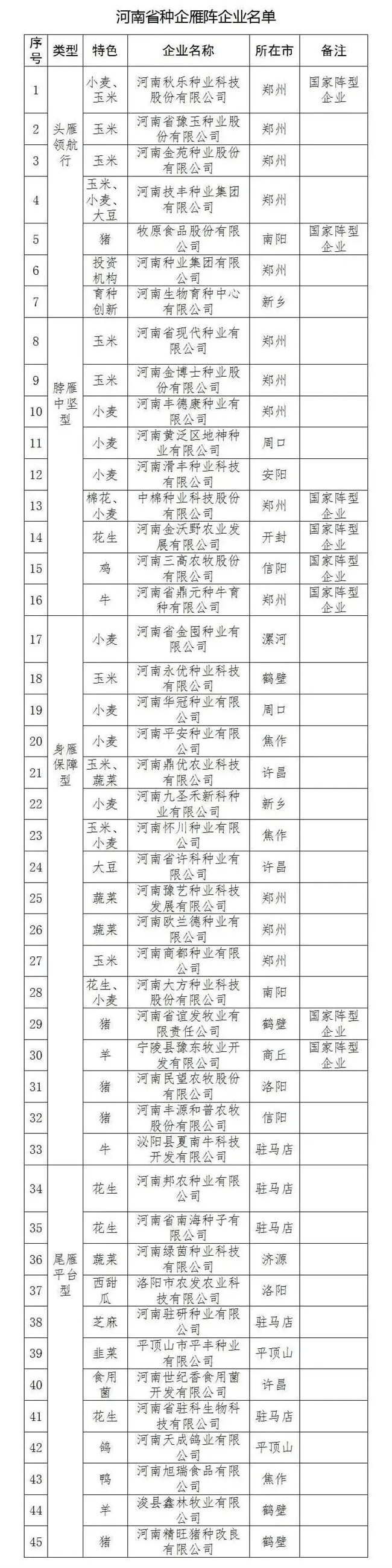2024年10月,河南省農(nóng)業(yè)農(nóng)村廳發(fā)布關(guān)于擬定河南省種企雁陣企業(yè)名單的公示,遴選河南秋樂(lè)種業(yè)科技股份有限公司、牧原食品股份有限公司等45家企業(yè)為河南省種企雁陣企業(yè)。