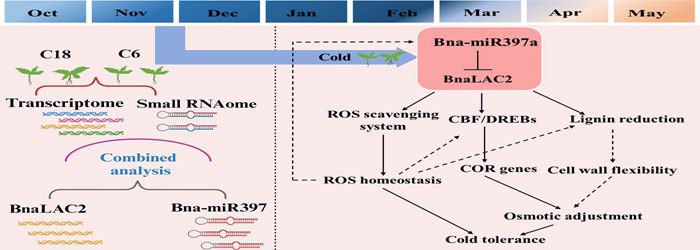 “油稻輪作”模式可以使長江中下游的“冬閑田”變成“增產(chǎn)田”,但如果晚稻收割延期就會使油菜播種遭遇低溫凍害,對油菜生產(chǎn)造成不利影響。針對這一問題,研究團(tuán)隊挖掘出調(diào)控油菜抗寒性狀的關(guān)鍵基因模塊,系統(tǒng)構(gòu)建出油菜抗寒基因調(diào)控理論模型,該模型可強(qiáng)化細(xì)胞結(jié)構(gòu)穩(wěn)定性,增強(qiáng)油菜抗氧化功能,從而提高油菜抗凍生長能力。目前,已證實(shí)該模型在十字花科植物中具有普適性,對促進(jìn)長江中下游糧油增產(chǎn),提升冬閑田利用率具有重要作用。