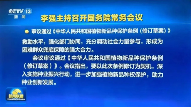 會議審議通過《中華人民共和國植物新品種保護條例(修訂草案)》。會議指出,要以此次條例修訂為契機,深入實施種業(yè)振興行動,進一步加強植物新品種權保護,助力種業(yè)創(chuàng)新發(fā)展。