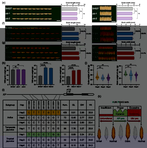 研究人員在秈稻與粳稻中過表達新基因“鯤鵬”,均表現(xiàn)出籽粒粒長、粒寬及千粒重的顯著提高,其中千粒重增幅更是高達30%~40%。相反,該基因敲除后,籽粒大小及千粒重顯著下降,確認了“鯤鵬”在籽粒大小和粒重中的正向調控作用。有趣的是,對粒重的正調控作用僅發(fā)生在利用“鯤鵬”內源啟動子對其進行過表達,而組成型啟動子過表達時粒重未改變,表明“鯤鵬”對粒重的正調控作用需要其適當的動態(tài)表達,而并非持續(xù)性高表達。