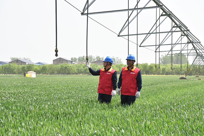 4月17日,原陽縣供電公司師寨服務(wù)站工作人員到中原農(nóng)谷高標(biāo)準(zhǔn)農(nóng)田巡視維護(hù)灌溉設(shè)備,宣傳安全用電注意事項。董鵬磊 攝