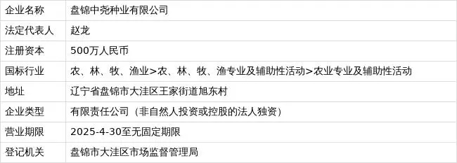 天眼查App顯示,近日,盤錦中堯種業(yè)有限公司成立,法定代表人為趙龍,注冊(cè)資本500萬(wàn)人民幣,由盤錦中堯農(nóng)墾集團(tuán)有限公司全資持股。