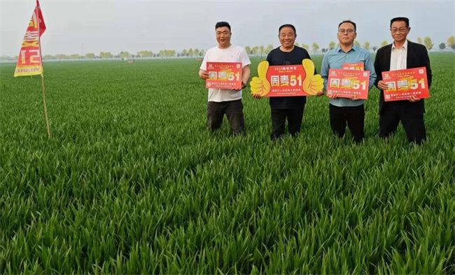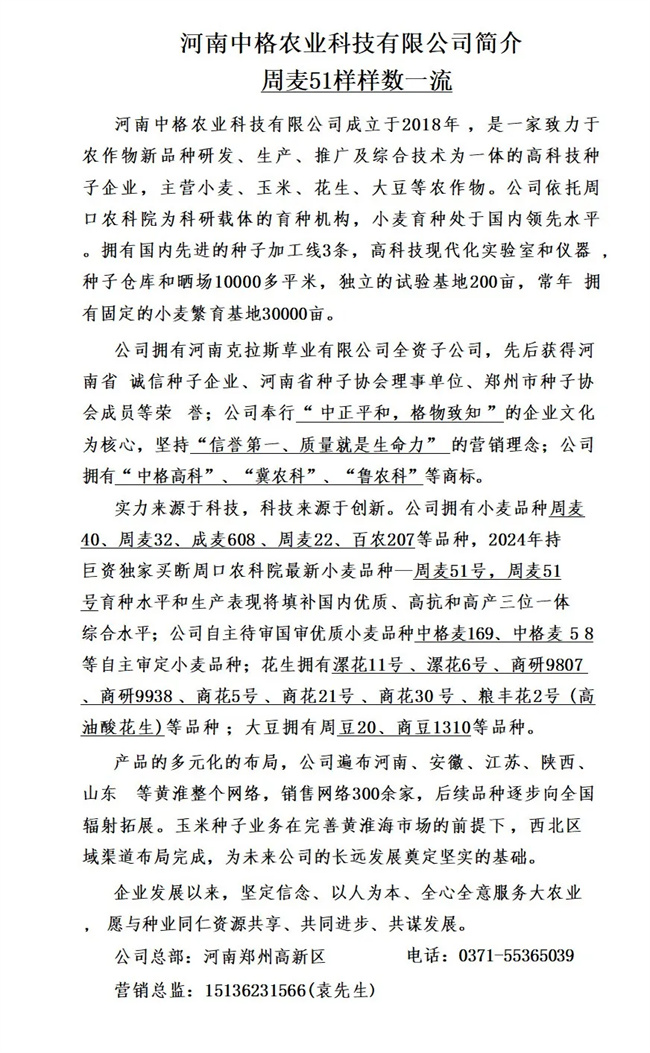 “周麥51”由周口市農(nóng)業(yè)科學(xué)院通過常規(guī)定量育種+雙單倍體育種( DH )+分子標(biāo)記輔助育種( MAS )+抗病性接種和抗逆性鑒定+就地一年4次加代技術(shù)+品質(zhì)平行測定篩選等技術(shù)選育而成,該品種特點(diǎn)為矮稈大穗、高抗病、抗倒性特強(qiáng)、高產(chǎn)穩(wěn)產(chǎn)優(yōu)質(zhì),綜合育種技術(shù)處于國內(nèi)領(lǐng)先水平。由河南中格農(nóng)業(yè)科技有限公司獨(dú)家經(jīng)營。