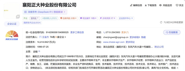 公開(kāi)信息顯示,正大種業(yè)成立于1996年7月,距今已經(jīng)有近30年的經(jīng)營(yíng)歷史,注冊(cè)資本1.44億元,注冊(cè)地址為湖北自貿(mào)區(qū)襄陽(yáng)片區(qū),主營(yíng)業(yè)務(wù)為玉米種子研發(fā)、生產(chǎn)、銷(xiāo)售,是國(guó)家育繁推一體化種業(yè)企業(yè)。