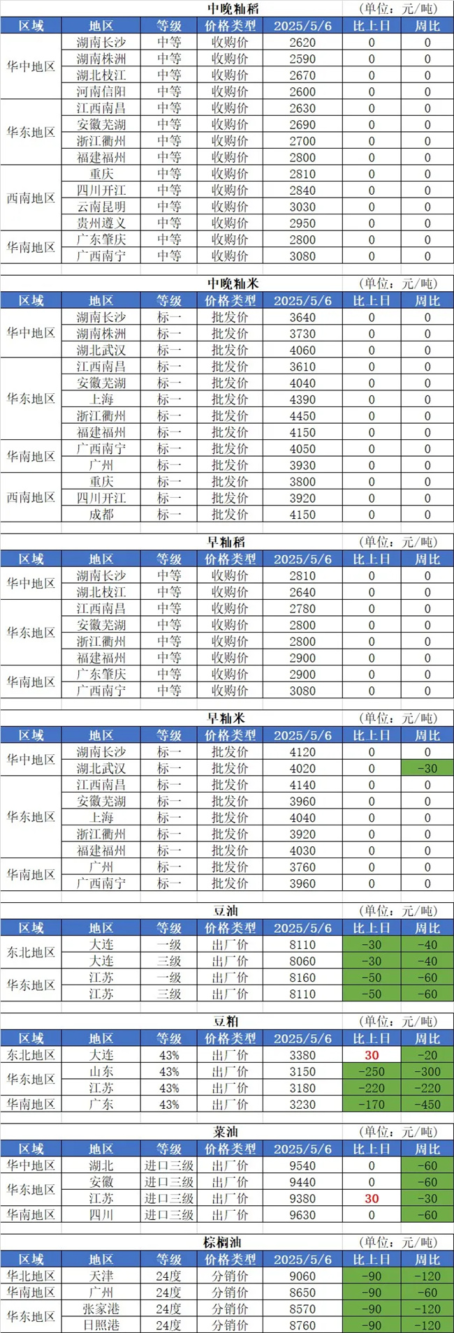 3、5月6日,最低收購價稻谷拍賣共投放約61.9萬噸,成交約10.4萬噸。其中早秈稻投放約1.8萬噸,無成交;中晚秈稻投放約30.1萬噸,成交約0.5萬噸,成交均價2601元/噸;粳稻投放約30萬噸,成交約9.9萬噸,成交均價2625元/噸。