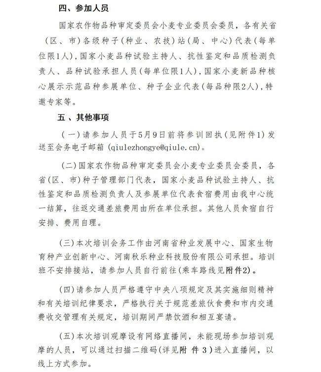 品種試驗(yàn)技術(shù)培訓(xùn)交流,加大小麥優(yōu)良新品種宣傳推廣力度,促進(jìn)種企合作、引領(lǐng)種業(yè)發(fā)展,我中心定于2025年5月中旬在河南省新鄉(xiāng)市舉辦小麥新品種核心展示示范暨品種試驗(yàn)培訓(xùn)班?,F(xiàn)將有關(guān)事項(xiàng)通知如下。