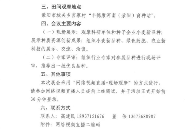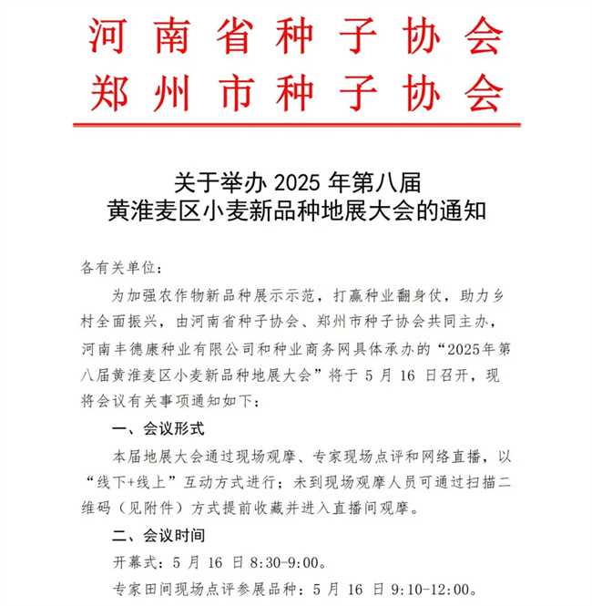 為加強(qiáng)農(nóng)作物新品種展示示范,打贏種業(yè)翻身仗,助力鄉(xiāng)村全面振興,由河南省種子協(xié)會(huì)、鄭州市種子協(xié)會(huì)共同主辦,河南豐德康種業(yè)有限公司和種業(yè)商務(wù)網(wǎng)具體承辦的“2025年第八屆黃淮麥區(qū)小麥新品種地展大會(huì)”將于5月16日召開(kāi),現(xiàn)將會(huì)議有關(guān)事項(xiàng)通知如下: