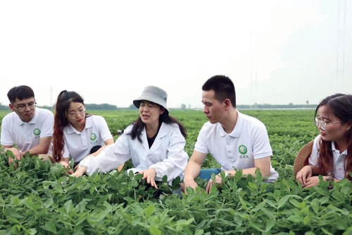 殷冬梅(中)和學(xué)生們?cè)谔镩g地頭觀察花生生長(zhǎng)情況?!≠Y料圖
