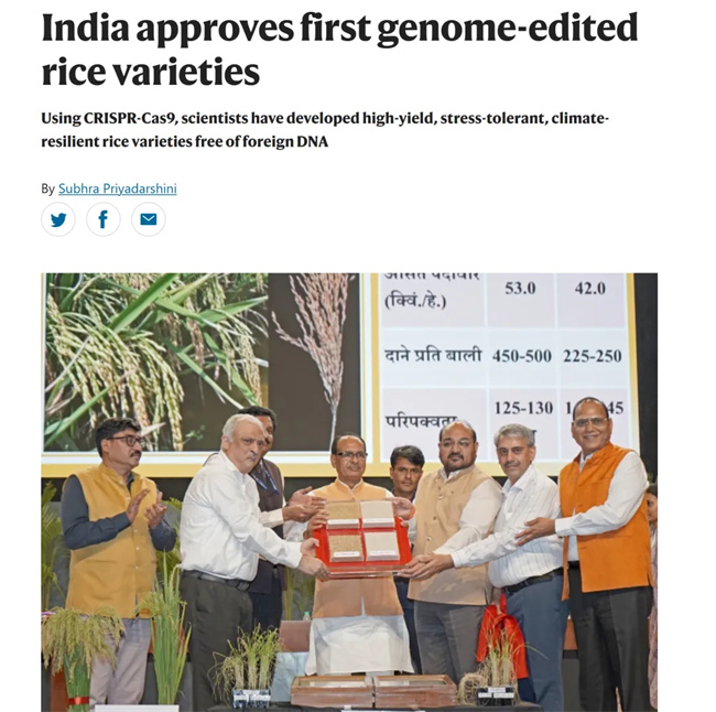 2025年5月4日,印度政府宣布批準(zhǔn)兩個(gè)本土研發(fā)的基因編輯水稻品種Pusa rice DST1和DRR Dhan 100進(jìn)入大規(guī)模種植試驗(yàn)階段,后續(xù)推進(jìn)商業(yè)化推廣。