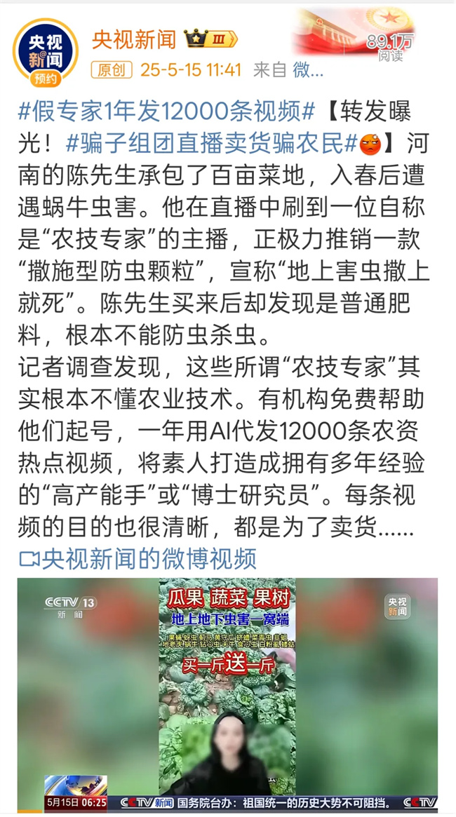 而根據(jù)調(diào)查,這類機(jī)構(gòu)甚至不是農(nóng)業(yè)相關(guān)的公司,文案都是通過AI抓取當(dāng)下熱點(diǎn)批量生產(chǎn)的,甚至提供的產(chǎn)品也有假冒偽劣,從人設(shè)到內(nèi)容再到產(chǎn)品,毫無含金量,只是為了收割農(nóng)民!