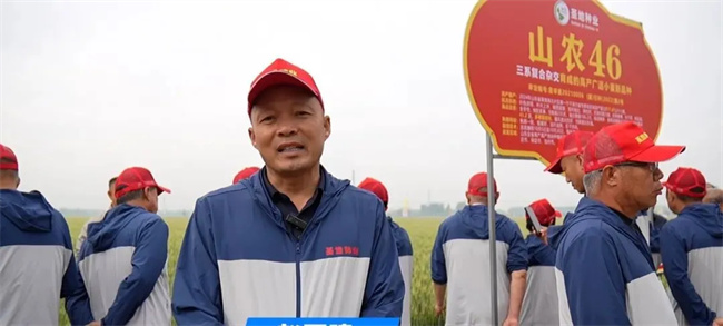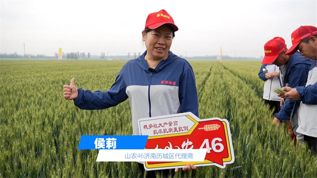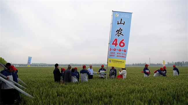 觀摩會(huì)上,山農(nóng)46和濟(jì)儒麥24、菏麥127三大明星品種吸引了眾多關(guān)注。山農(nóng)46由山東農(nóng)業(yè)大學(xué)選育,具有高產(chǎn)穩(wěn)產(chǎn)、廣適冬性等特點(diǎn)。其苗期抗寒性強(qiáng),分蘗能力強(qiáng),成穗率高,畝穗數(shù)超43.9萬(wàn),穗粒數(shù)達(dá)40粒,千粒重45—48克。在區(qū)試預(yù)試中,較對(duì)照增產(chǎn)顯著,生產(chǎn)試驗(yàn)增產(chǎn)5.2%,居小組第二。此外,該品種莖稈韌性好,抗倒能力強(qiáng),后期抗干熱風(fēng),落黃熟相佳,綜合表現(xiàn)突出,深受農(nóng)戶喜愛(ài)。