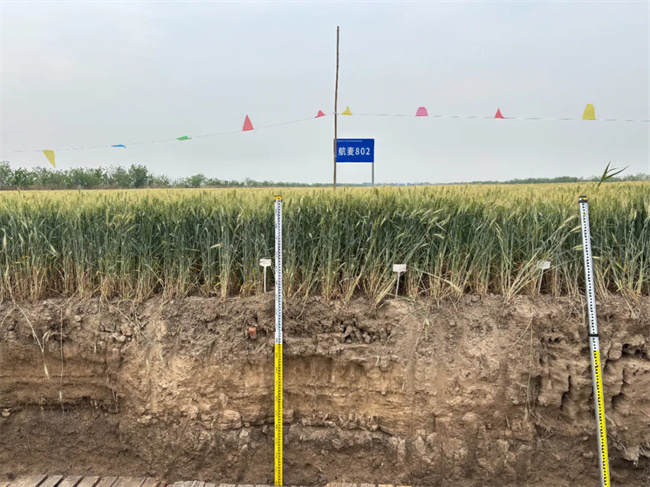 期間,與會專家實地觀摩了正在開展耐鹽堿鑒定的60份新品系和30個新品種,詳細了解了大區(qū)展示的“航麥802”、“濟麥60”等耐鹽新品種以及“滄麥6002”、“滄麥6005”、“中麥36”、“渭麥9號”、“滄麥15”、“滄麥16”、“滄麥17”、“捷麥19”、“捷麥20”、“衡麥30”等前期鑒定出的耐鹽小麥品種,以及全雨養(yǎng)條件下的耐鹽優(yōu)質(zhì)高產(chǎn)小麥“航麥802”百畝示范方。其中,“航麥802”在平均含鹽量為3.21‰和3.39‰的兩個觀摩點,可見根系長度1米以上,畝穗數(shù)分別為35.5萬和33.8萬、穗粒數(shù)分別為31.3粒和35.6粒,展現(xiàn)出其在耐鹽環(huán)境中根系發(fā)育、群體建成、高抗倒伏等方面的獨特優(yōu)勢和豐產(chǎn)潛力。