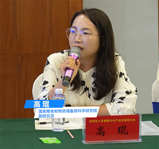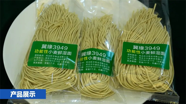 河北旺豐種業(yè)公司總經(jīng)理曲俊旺在會上匯報(bào)發(fā)言。冀緣3949是該公司自主選育的高產(chǎn)穩(wěn)產(chǎn)、中強(qiáng)筋小麥新品種,具有株型緊湊、株高72厘米、抗倒性好、產(chǎn)量三要素協(xié)調(diào)且增產(chǎn)潛力大的特點(diǎn)。2020年,經(jīng)河北省農(nóng)作物品種品質(zhì)檢測中心測定,該品種粗蛋白質(zhì)(干基)含量為13.1%,濕面筋(14%濕基)含量為24.5%,吸水量為61.0毫升/100克,穩(wěn)定時(shí)間為13.0分鐘,拉伸面積為81.0平方厘米,最大拉伸阻力為456EU,容重為840克/升。值得一提的是,冀緣3949籽粒呈偏黃色,加工出的面粉為淡黃色,且營養(yǎng)成分豐富。經(jīng)有關(guān)檢測機(jī)構(gòu)對2024年收獲的籽粒測定,其葉黃素含量比區(qū)試對照品種高出3.67倍,β-胡蘿卜素含量高出1.51倍。葉黃素具有保護(hù)視力的作用,可預(yù)防重度近視及視網(wǎng)膜剝離;β-胡蘿卜素可改善夜盲癥和皮膚粗糙狀況。