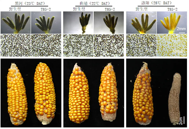全國(guó)14個(gè)生態(tài)試驗(yàn)點(diǎn)鑒定了揭示了突變體地理-溫度-雄花育性耦合規(guī)律:北方春玉米區(qū)(黑河、佳木斯)、黃淮海北部(北京、石家莊)及西南高海拔區(qū)(曲靖)等日均溫≤25℃區(qū)域,育性正常,適合繁親;黃淮海南部(洛陽(yáng)、新鄉(xiāng))、南方丘陵區(qū)(南京、武漢)及西北干旱區(qū)等日均溫≥28℃區(qū)域,突變體雄性不育,適宜于繁雜(圖2)。