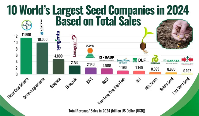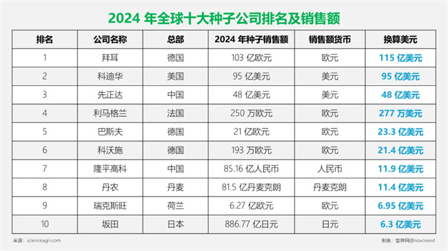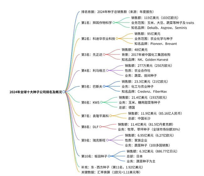 2024 年全球十大種子公司按種子總銷售額排名,拜耳作物科學(xué)以 115 億美元(103 億歐元)居首,其種子業(yè)務(wù)涵蓋玉米、大豆等多類作物品牌;科迪華農(nóng)業(yè)科技以 95 億美元緊隨其后,擁有 “先鋒” 等知名種子品牌;先正達(dá)以 48 億美元排名第三,2017 年被中國化工集團(tuán)收購;其他上榜公司包括巴斯夫(23.3 億美元)、KWS(21.4 億美元)、利馬格蘭(277 萬美元)、袁隆平高科(11.9 億美元)、DLF(11.4 億美元)、瑞克斯旺(6.95 億美元)和坂田種子(6.3 億美元),這些公司在不同作物種子領(lǐng)域各有優(yōu)勢(shì),數(shù)據(jù)源于 2024 年年度報(bào)告,銷售額以各公司官方貨幣按匯率換算為美元。