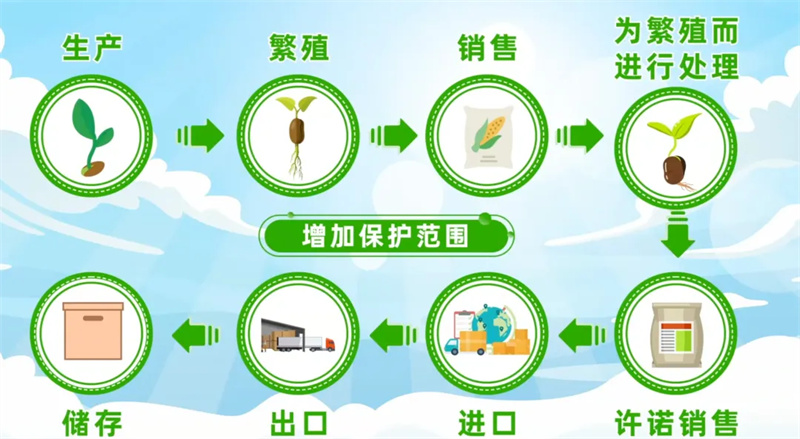 保護環(huán)節(jié)由生產(chǎn)、繁殖、銷售3個環(huán)節(jié)擴展到為繁殖而進行處理、許諾銷售、進口、出口、儲存等8個環(huán)節(jié);
