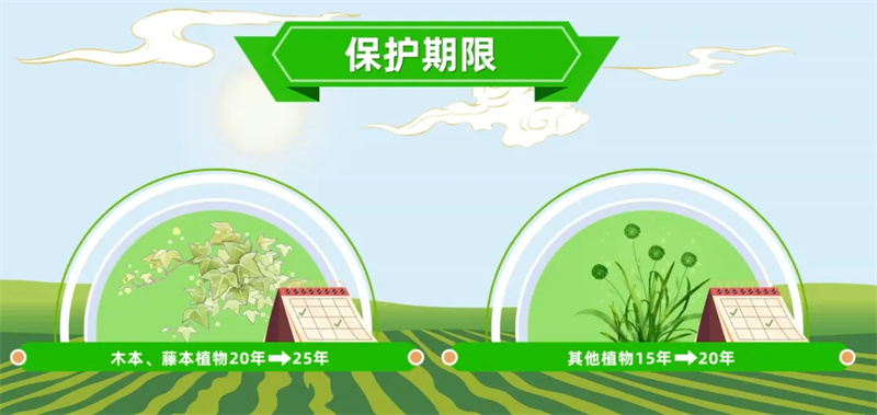 木本、藤本植物保護期限由20年延長到25年。其他植物保護期限由15年延長到20年。