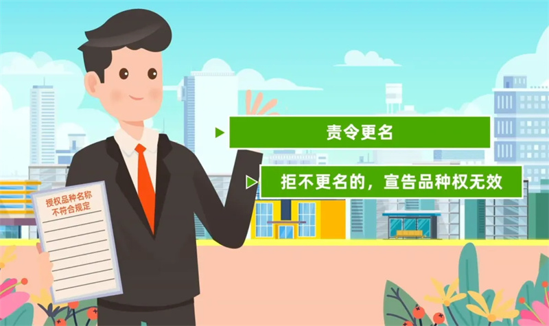 增加不得用于品種命名的情形;授權(quán)品種名稱不符合規(guī)定的,責令更名,拒不更名的,宣告品種權(quán)無效。