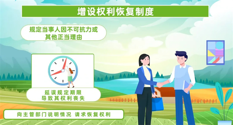 由6個月改為3個月,情況復(fù)雜的可延長3個月。增設(shè)權(quán)利恢復(fù)制度。規(guī)定當事人因不可抗力或其他正當理由而延誤規(guī)定期限、導(dǎo)致其權(quán)利喪失的,可向主管部門說明理由,請求恢復(fù)權(quán)利。