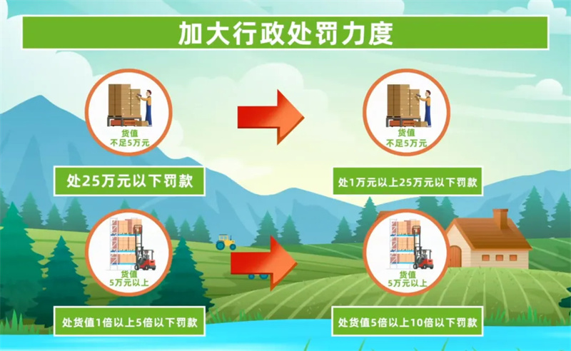 貨值不足5萬元的,由處25萬元以下罰款修改為處1萬元以上25萬元以下罰款。貨值5萬元以上的,由處貨值1倍以上5倍以下罰款修改為處貨值5倍以上10倍以下罰款。