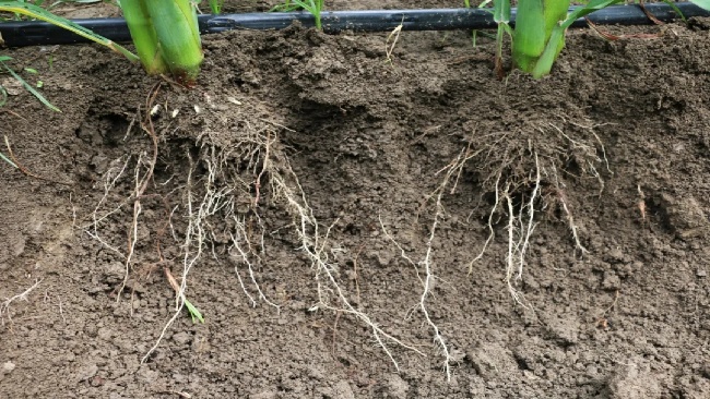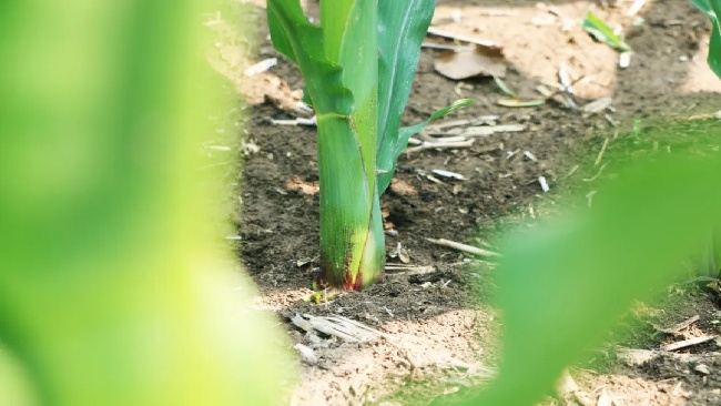六月初的皖北平原熱浪初涌,利辛縣程家集鎮(zhèn)連片玉米地翻滾著青紗帳般的綠浪。鄧大姐蹲在田埂邊,向我們展示著兩株玉米根部的土壤,露出盤結(jié)的根系:“瞧智慧棒京科501這根系多壯實,盤結(jié)如網(wǎng)!今年做的春播種植,得有6700株,你看這根扎得多穩(wěn),稈子一看就扛得住風(fēng)雨。”她身后,齊肩高的玉米稈列隊挺立,葉片舒展如劍。
