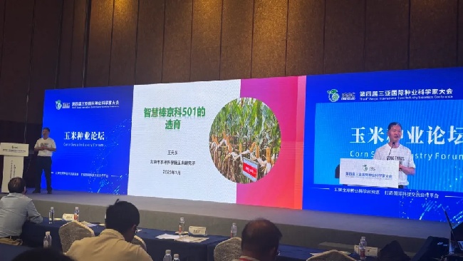 ▲智慧棒京科501亮相第四屆三亞國際種業(yè)科學(xué)家大會,王元東研究員作智慧棒選育報告