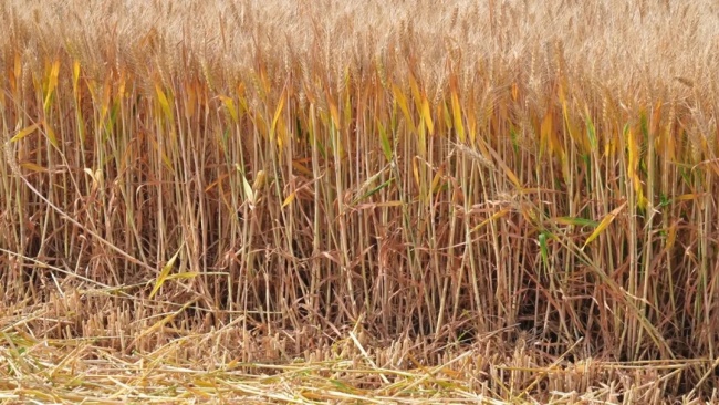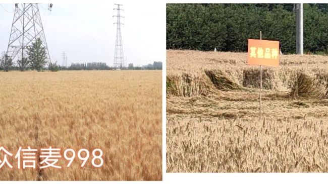 ▲6月9日晚上一場雷雨大風后,一路之隔的眾信麥998與其它品種抗倒效果明顯。