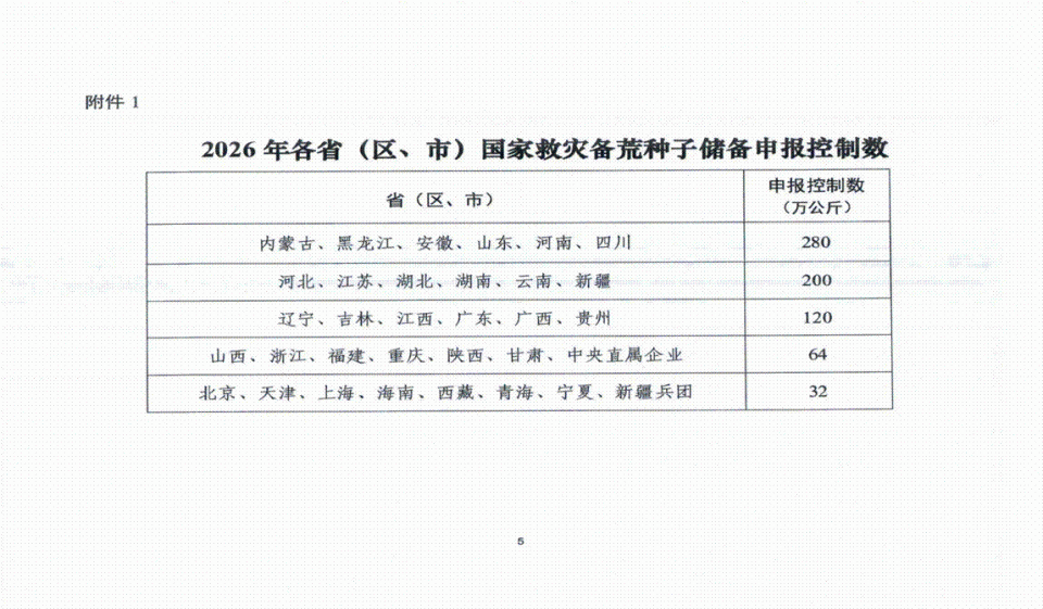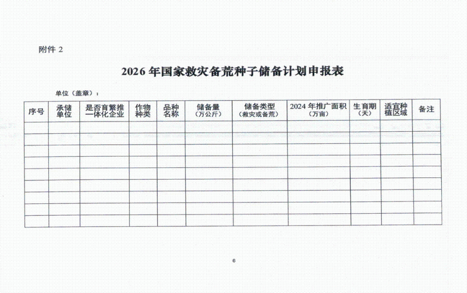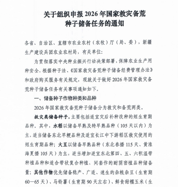 附件:農(nóng)業(yè)農(nóng)村部種業(yè)管理司關(guān)于組織申報2026年國家救災(zāi)備荒種子儲備任務(wù)的通知