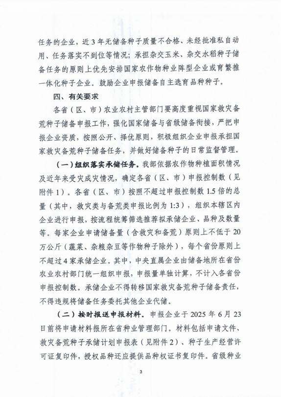 現(xiàn)將農(nóng)業(yè)農(nóng)村部種業(yè)管理司《關(guān)于組織申報2026年國家救災(zāi)備荒種子儲備任務(wù)的通知》(農(nóng)種市函〔2025〕13號)轉(zhuǎn)發(fā)你們。請我省符合條件、有意愿申報的農(nóng)作物種子企業(yè)積極申報,于6月23日前將申請材料報省種子站(以收到紙質(zhì)申報材料為準),逾期不再受理。