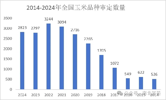 2014-2024年全國玉米品種審定總數(shù)為21413個(gè)。2017年以后,隨著聯(lián)合體、綠色通道試驗(yàn)開展以來,全國玉米品種審定數(shù)量迅猛增長,2021-2022年達(dá)到最高峰,分別為3094和3244個(gè),2023、2024年全國玉米品種審定總數(shù)穩(wěn)定在2800個(gè)左右。
