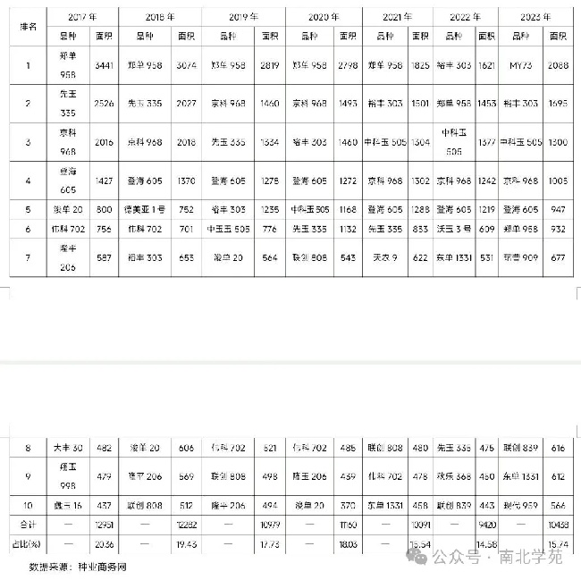 表2 2017-2023年全國玉米推廣前十品種推廣種植面積統(tǒng)計(jì)(單位:萬畝)