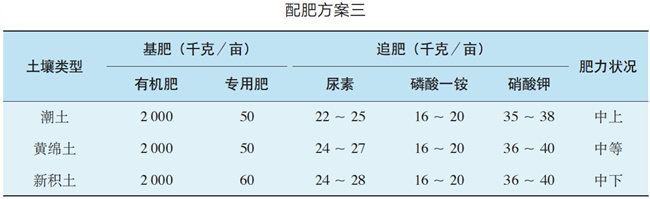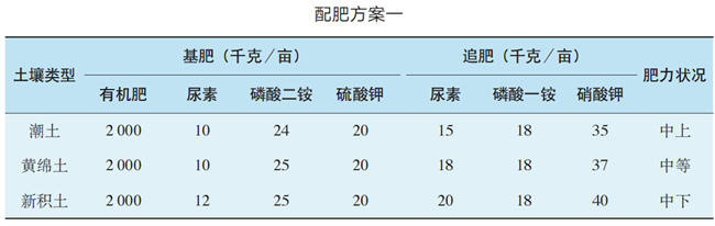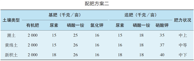 方案二:根據(jù)不同土壤類型,確定化肥以尿素、磷酸一銨、氯化鉀為基肥,尿素、磷酸一銨、硝酸鉀為追肥的配肥方案,詳見(jiàn)下表。