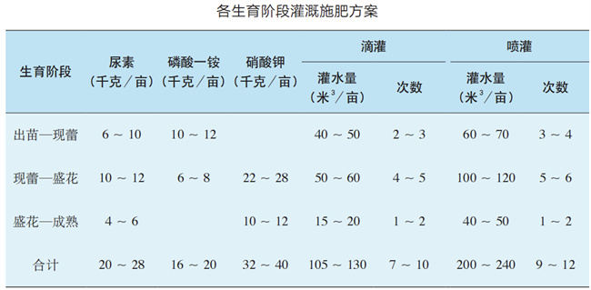 追肥根據(jù)不同生育階段的需肥規(guī)律,將配肥方案一至三確定的用量通過(guò)滴灌或噴灌的方式施入,因水施肥、以水促肥,從而達(dá)到馬鈴薯水肥一體化應(yīng)用,灌溉次數(shù)、用水量、施肥量參考下表。