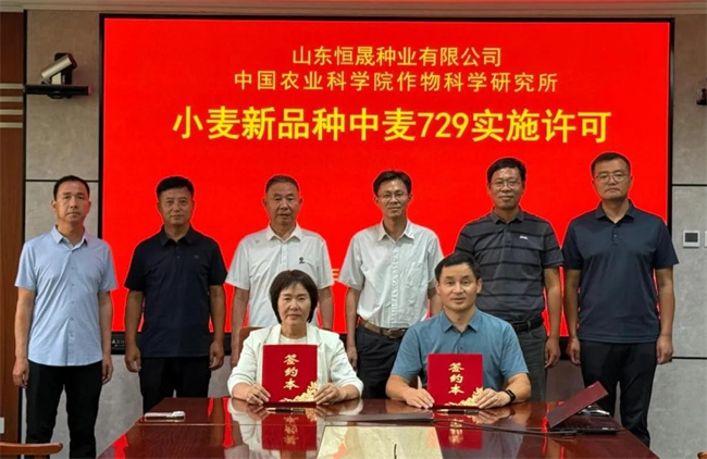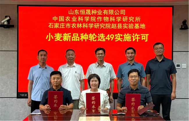 6月23日,中國農業(yè)科學院作物科學研究所、石家莊市農林科學研究院與山東恒晟種業(yè)有限公司在北京簽署小麥新品種“輪選49”新審定區(qū)域知識產權實施許可和“中麥729”成果轉讓協(xié)議。作科所張宏軍研究員、肖永貴、石家莊市農科院李輝利研究員與山東恒晟種業(yè)總經理吳秀云分別代表各方簽約。作科所所長周文彬,山東恒晟種業(yè)董事長孟凡金以及來自三方的研發(fā)、轉化和推廣人員代表共同見證了簽約活動。
