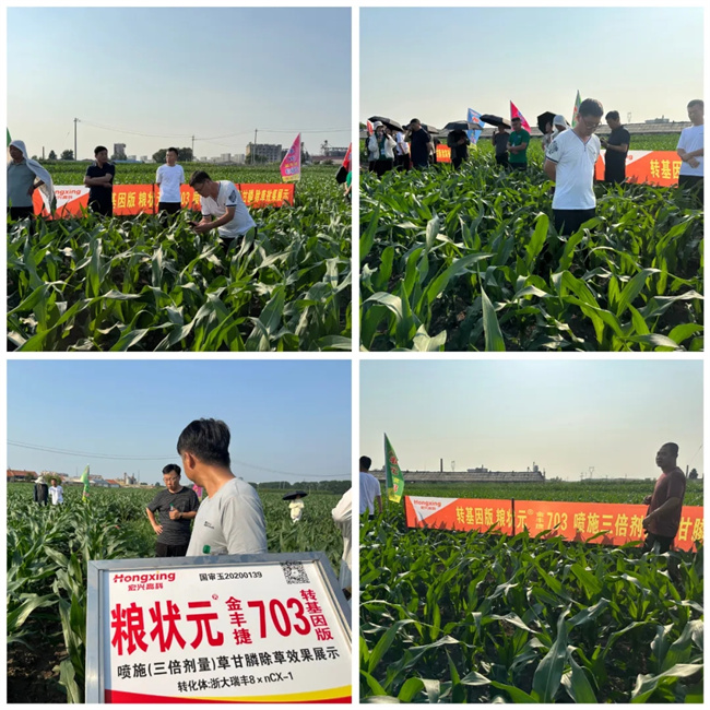 ▲觀摩糧狀元®金豐捷703展示田以及轉(zhuǎn)基因版糧狀元®金豐捷703在噴施三倍劑量草甘膦之后的除草效果展示